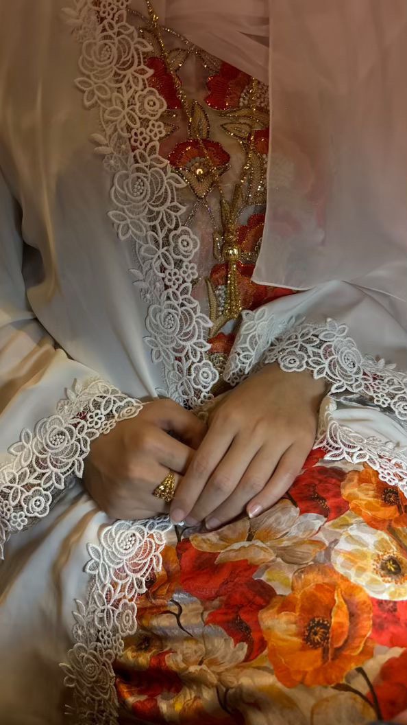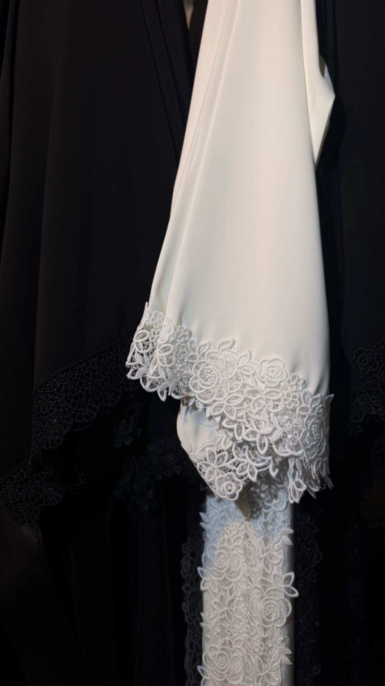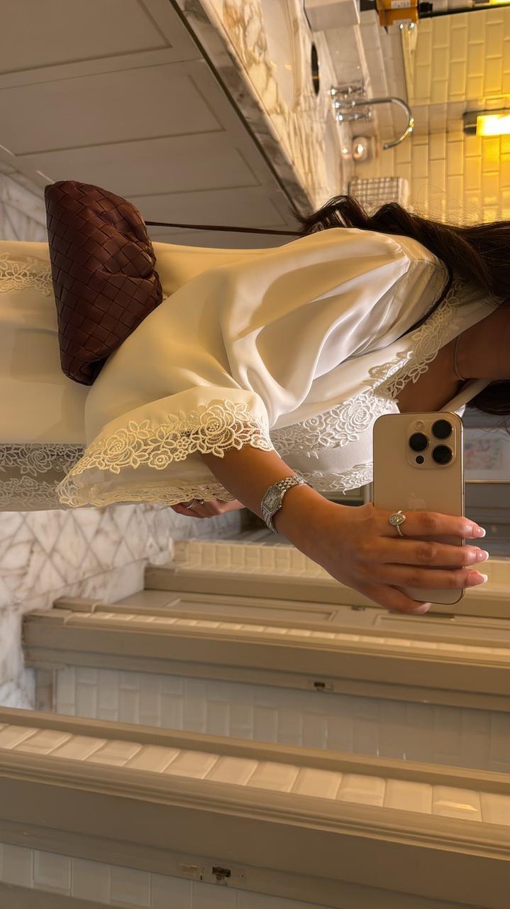 الدانتيل على طرف العباه وفي الوسطه و على الكم